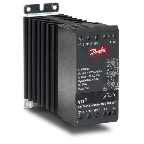 VLT® Compact Starter MCD 200 from Danfoss includes twofamilies of soft starters in the power range 7.5–110 kW.The series offers easy DIN rail mounting for sizes up to 30 kW,2-wire or 3-wire start/stop control and excellent startingduty (4 x Ie for 6 seconds).Heavy starting rating at 4x Ie for 20 seconds.Compatible with grounded delta power systems